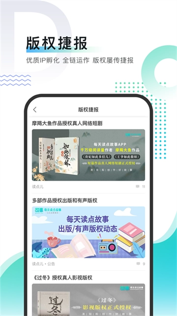 读点已与多家出版文化公司和出版社达成合作,已成功授权《她从梦里来》《京城情报司》《影帝他总想对我图谋不轨》《宇宙留言》《羲河传》《神探太子妃》《凡人笔谈》《风水师报君知》《裁员专家》等数十部独家签约类型作品进行实体书出版,其中《愿所有的姑娘都能嫁给爱情》是由读点和出版方联合征文的获奖作品集结成书。
