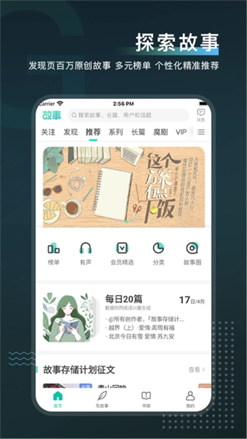 每天读点故事App是一款故事阅读写作软件,这里拥有超多类型的故事,如悬疑惊悚、现实情感、浪漫言情等,用户可以在这里轻松找到自己喜欢的故事。软件坚持“原生、奇崛、动人”的内容主张,为用户提供海量精彩原创好故事。