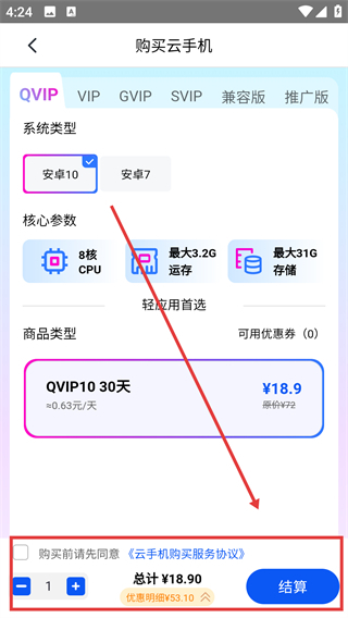 2、进入购买页面后,选择好【QVIP1030天】套餐,在同意相关协议后点击【结算】按钮,即可进入支付环节。