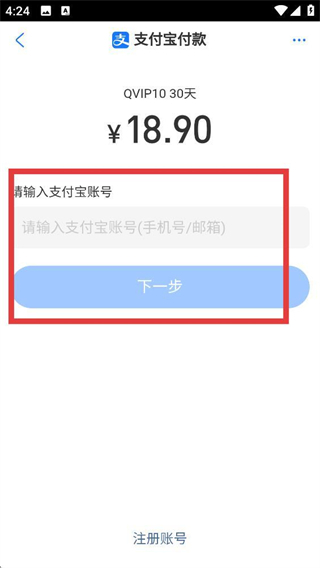 4、若选择支付宝支付,需在对应页面输入支付宝账号,点击【下一步】即可继续完成支付流程。