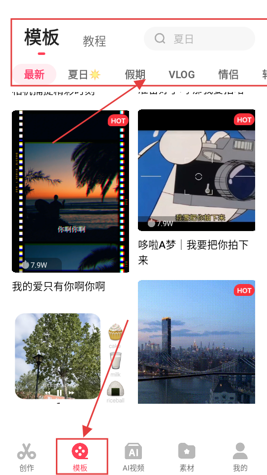 1、模板页面设有【最新】【夏日】等分类,海量模板可供挑选,底部的【模板】按钮十分醒目,点击它就能浏览各类模板了。
