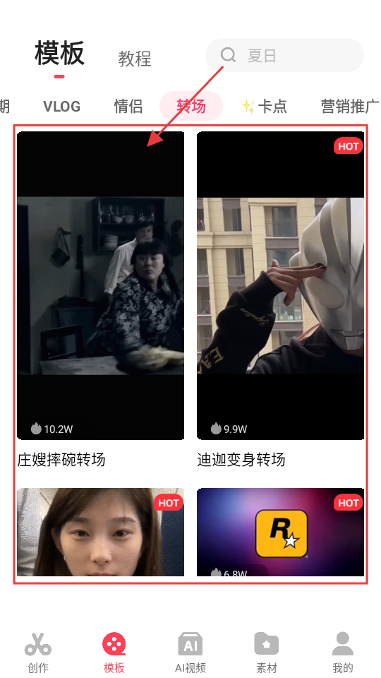 2、选择【转场】分类,这里面包含庄嫂摔碗转场、迪迦变身转场等多种模板,大家可以挑选自己喜欢的,点击进去就能查看具体详情啦。