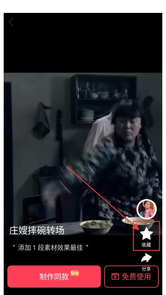 3、进入庄嫂摔碗转场模板的详情页面后,会看到非常有趣的画面,如果想要收藏,点击【收藏】按钮就可以了,操作十分便捷。