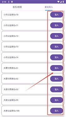 2、完成后进入美化导入页面,挑选自己所需的美化文件,点击注入按钮就能完成操作。
