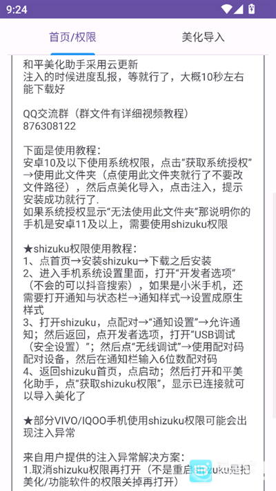 1、进入首页后,需先获取系统授权,也可点击获取shizuku权限。