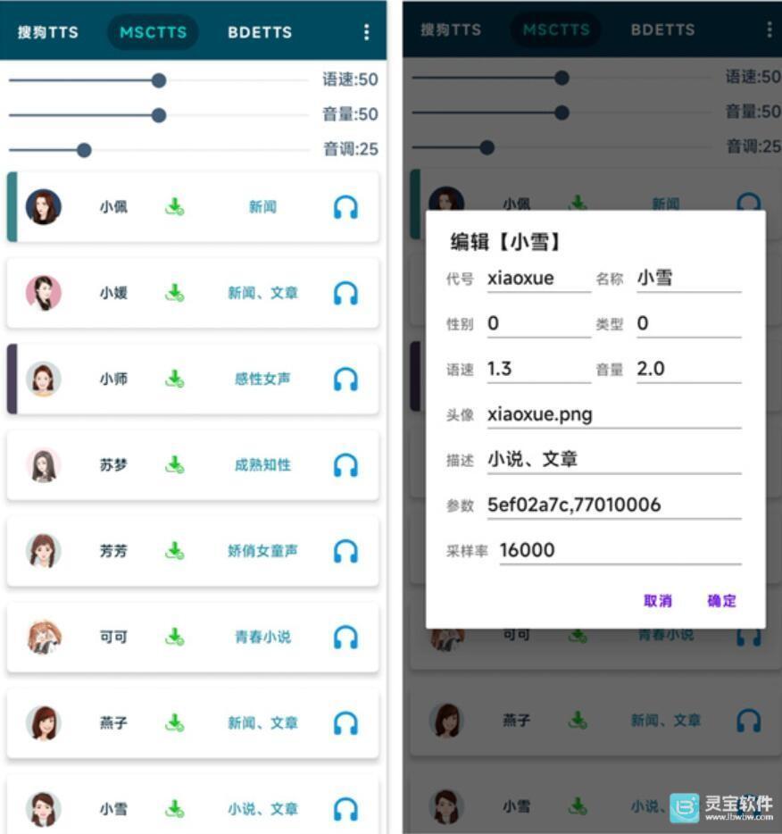 1、点击软件右上角的按钮选择导入语音包,等待一会就有数据了;导入成功之后,就能试听并编辑这些声音了,可以长按它们的头像,单独设置它们的语速音量等参数;