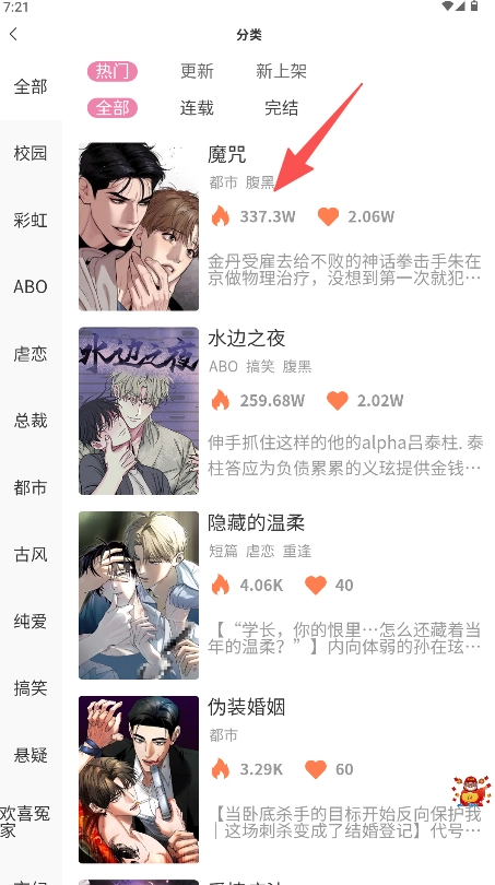 2、提供热门、更新等全局排序维度,便于用户快速发现当前流行或最新上架的作品。