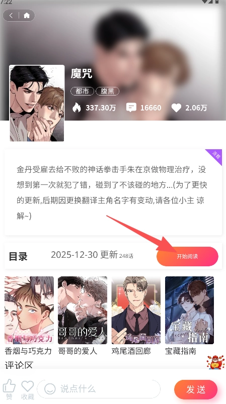 3、漫画详情页设计简洁,核心操作突出,直接提供醒目的开始阅读按钮以缩短阅读路径。