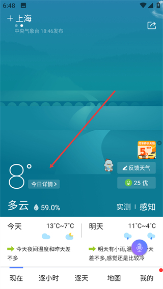 4、返回天气主页面,查看切换后城市(上海)的实时天气、温度及预报信息。