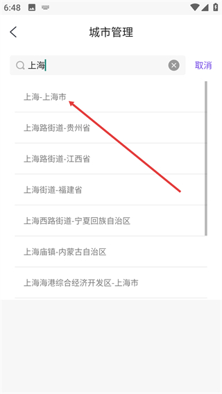 3、在搜索结果列表中选择目标城市(如“上海-上海市”),完成城市切换操作。