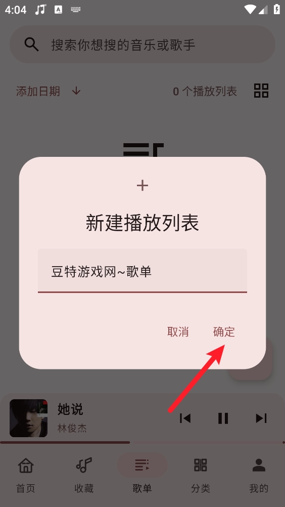 3、输入歌单名称后,点击"确定"即可创建。