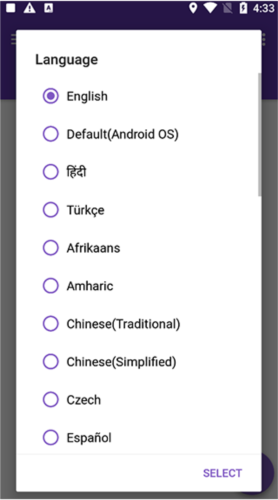 3、向下滑动找到“Chinese(Simplified)”选项,点击“SELECT”就能切换为简体中文