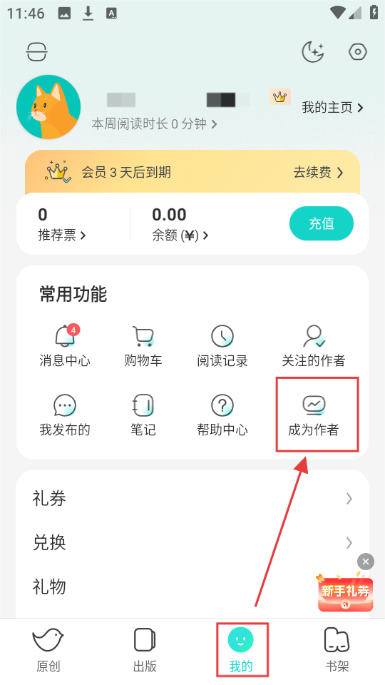 1、在“我的”页面,设有常用功能等板块,若想成为作者,点击【成为作者】按钮,即可进入对应的页面。