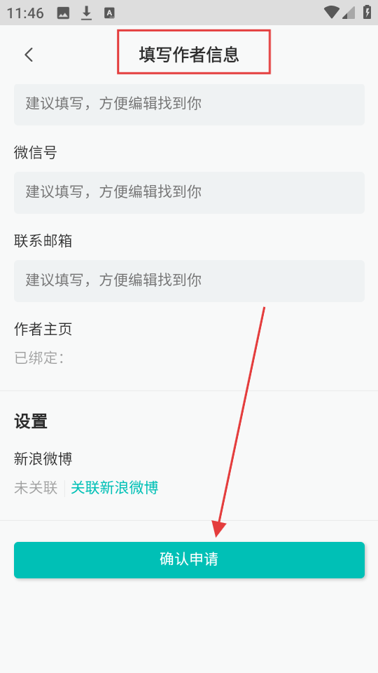4、进入作者信息填写页面,填写好相关信息后,点击【确认申请】按钮,即可完成作者申请流程并开始投稿。