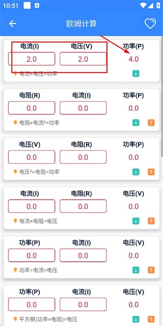 3、在欧姆计算页面填写相应的参数数值,就能得到对应的计算结果。
