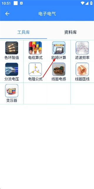 2、在电子电气工具库页面找到欧姆计算选项并点击,即可进入欧姆计算的操作界面。