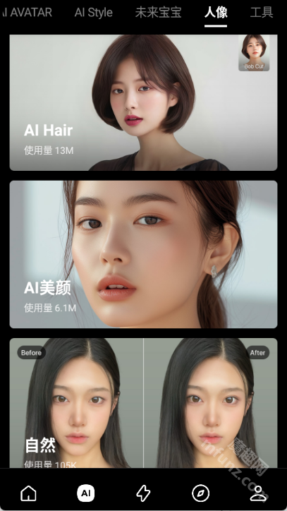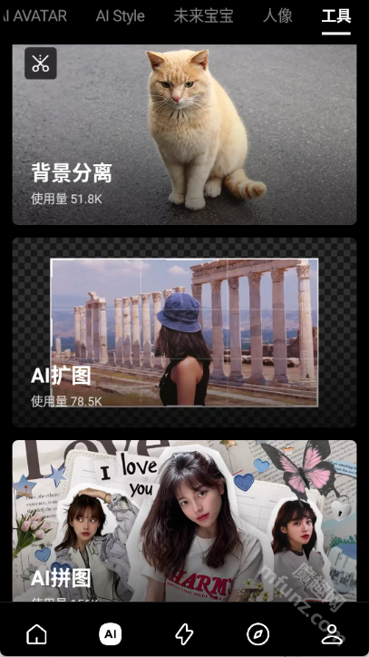创意编辑工具包:具备智能抠图、背景替换、发色发型调整功能,贴纸与文字模板多样,可一键生成拼图和海报。