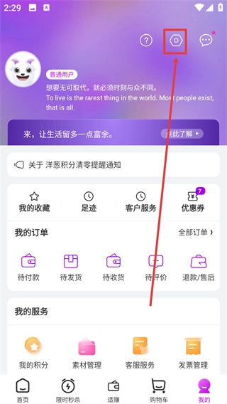 在【我的】页面中,点击右上角的【设置】图标,即可进入设置页面,进而开展账号、地址等相关配置操作。