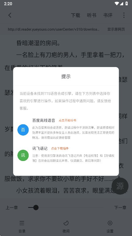 4. 免费听书功能:安装插件后,能将小说转化为音频进行播放,还支持调节播放速度,并且可以实现暂停、切换章节等操作。