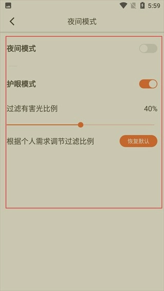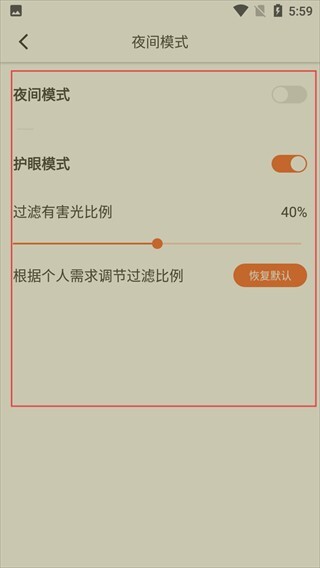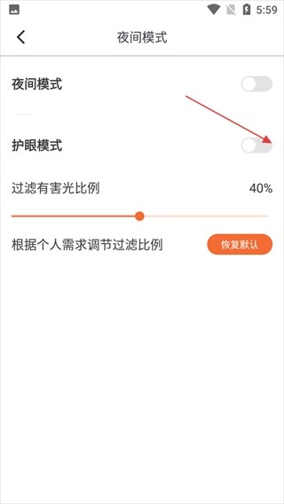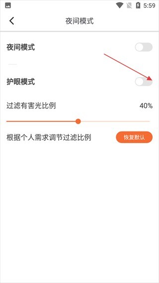 4、开启护眼模式后,还能对有害光的过滤比例进行调节,依据个人需求来优化阅读体验,若想重置设置,也可以点击【恢复默认】按钮。