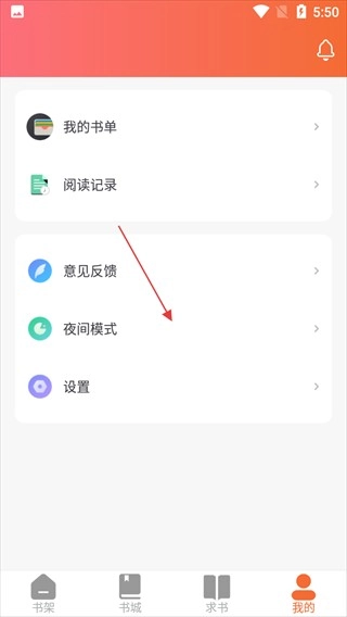 2、进入【我的】页面后,点击【夜间模式】选项,即可进入夜间模式设置页面,在该页面能够调整阅读时的显示效果。