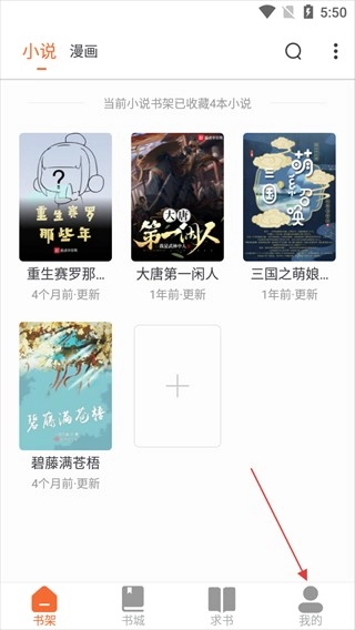 1、在书架页面能看到已收藏的小说,要是想调整阅读模式,点击右下角的【我的】就能进入个人页面。