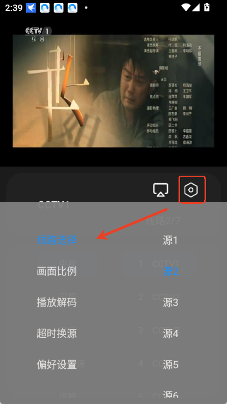 4、点击最右侧的图标,可进行线路选择、画面比例、播放解码、超时换源等设置。