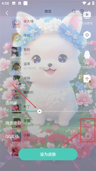 3、可拖动透明度滑块来调整显示效果,还能选择“微信皮肤”或“QQ皮肤”作为应用对象。
