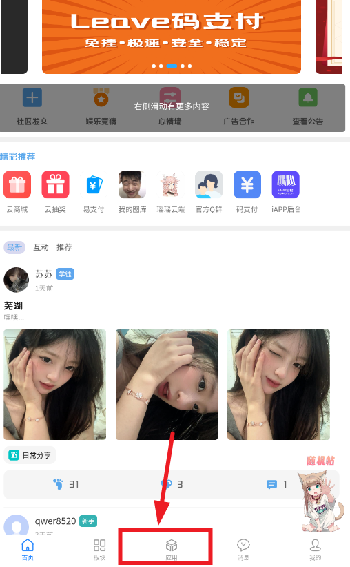 1、打开牛马社区,进入首页后,点击应用。