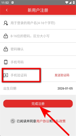 4、输入手机验证码,勾选相关协议后,点击完成注册按钮,即可完成账号注册流程。