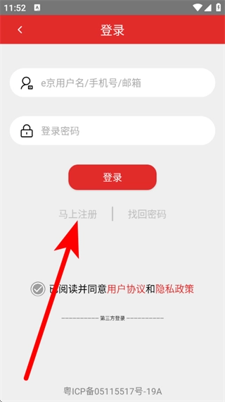 2、在登录页面,点击“马上注册”按钮,即可跳转至新用户注册页面。