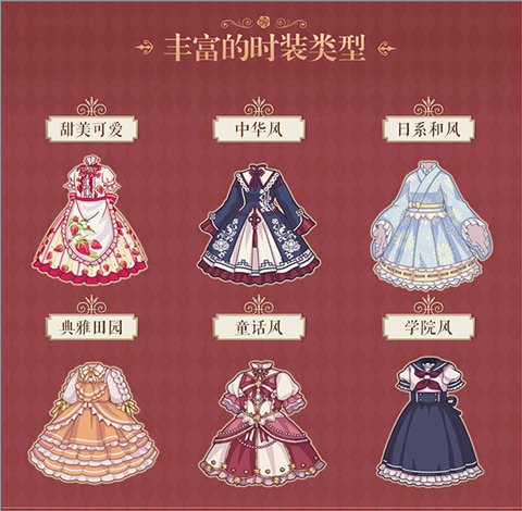 游戏里的服装类型十分多样,涵盖了甜美可爱、中华风、日系和风、典雅田园、学院风等不同风格,玩家能够挑选自己钟爱的风格来进行搭配。