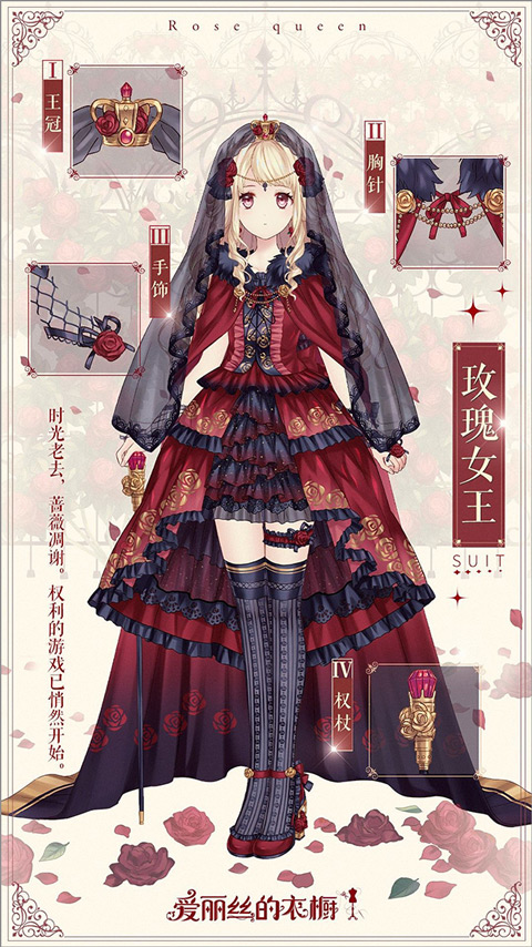 和女主角的配色形成对比的是,作为故事里最大的反派,红桃女王的配色也是爱丽丝风格裙子的一大特色,一般会采用红黑配色,再搭配上一些卡牌相关的元素。