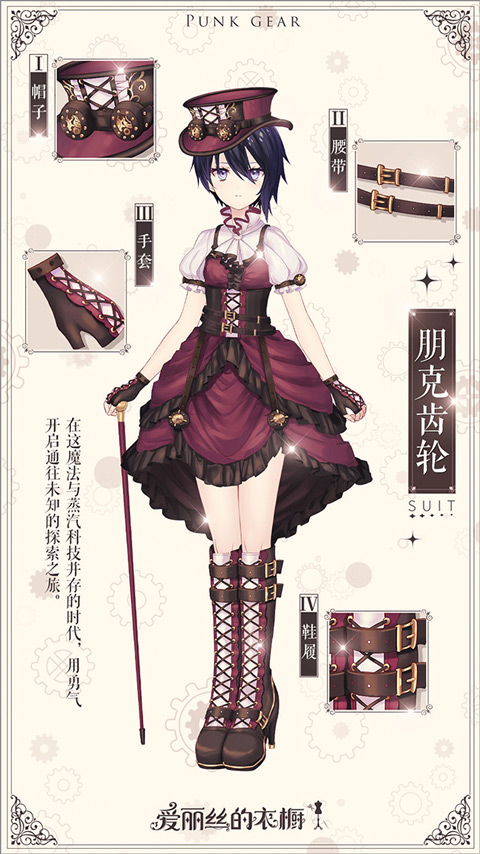 经典元素的奇妙碰撞,皮革、腰封、层叠的裙摆,再加上极具代表性的具象元素齿轮,这套服饰正是大家常说的蒸汽朋克风格洛丽塔(蒸朋lolita)。