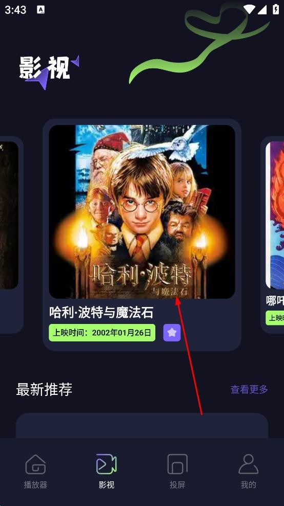 3、进入影视界面,界面展示了多部影视推荐,找到想要查看详情的影视,比如哈利·波特与魔法石,点击该影视。