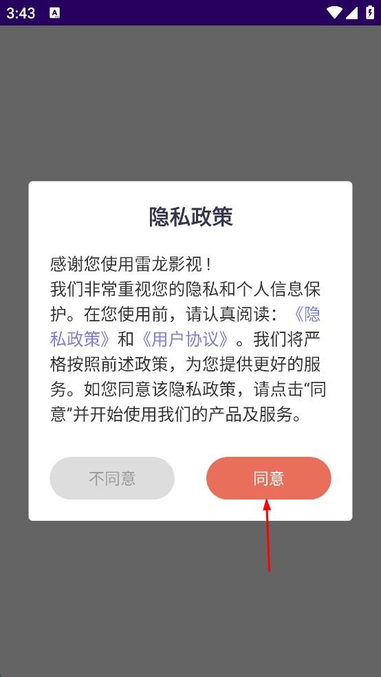 1、打开雷龙影视,进入隐私政策界面,界面说明重视用户隐私和个人信息保护,需阅读隐私政策和用户协议,点击“同意”按钮。