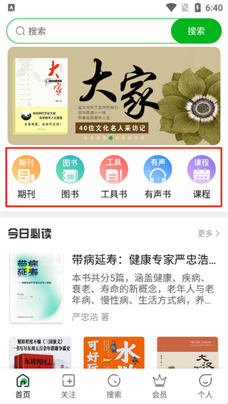 1、打开知网阅读App,在首页有【期刊、图书、工具书、有声书、课程等内容】选择一个板块进行跳转