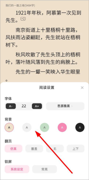 3、打开阅读设置页面,可以设置阅读字体大小、字体样式、阅读背景、翻页方式和锁屏设定。