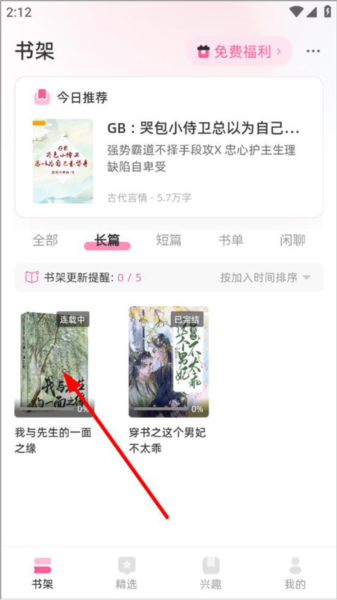 1、打开布咕阅读app,登录进入主页,主页书架可以查看用户添加的书籍信息以及每日推荐文章,点击书架中的书籍;
