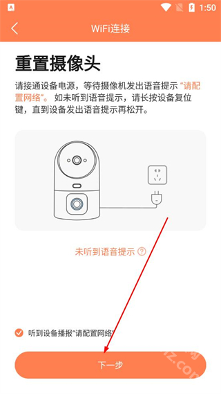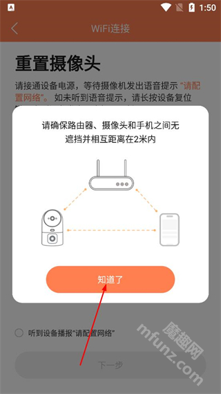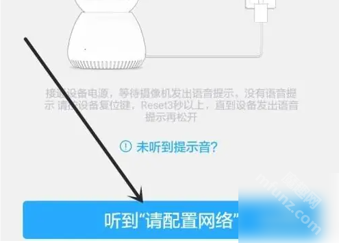 3、点击重置摄像头界面的“知道了”按钮,等待设备发出“请配置网络”的语音提示后,勾选“听到该提示”的选项。