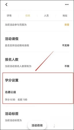 4、在活动的学分设置部分,可以查看完成该活动后可获得的学分。