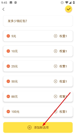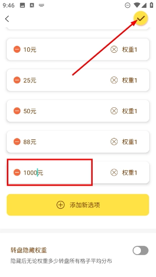 3、在主题选项配置页,点击底部对应按钮,可新增如【5元】-【100元】类的选项,同时可设置各选项的【权重】。