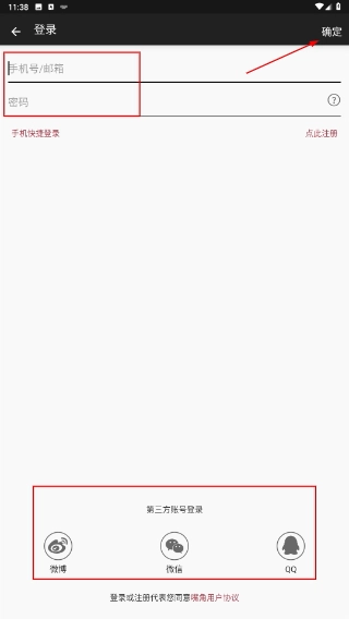 3、登录界面支持两种登录方式,一种是账号密码登录,另一种是借助微信、微博、QQ等第三方账号进行快捷登录。