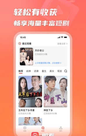 即看短剧为大家准备了丰富的短剧资源,所有资源都做了细致分类,用户能挑选自己感兴趣的内容观看。平台上的短剧全部免费,还配备了高清画质和个性化推荐等实用功能。另外,用户可以把喜欢的短剧缓存保存,就算没网络也能随时观看,让大家拥有更舒适的短剧观看体验!