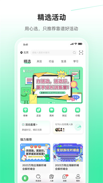 活动行官网版以相同的兴趣、一致的态度、好玩的活动为纽带,拉近彼此间的距离,让交流畅通无阻,同时更轻松发现身边的同类,结交新朋友,玩转身边的另一个世界。