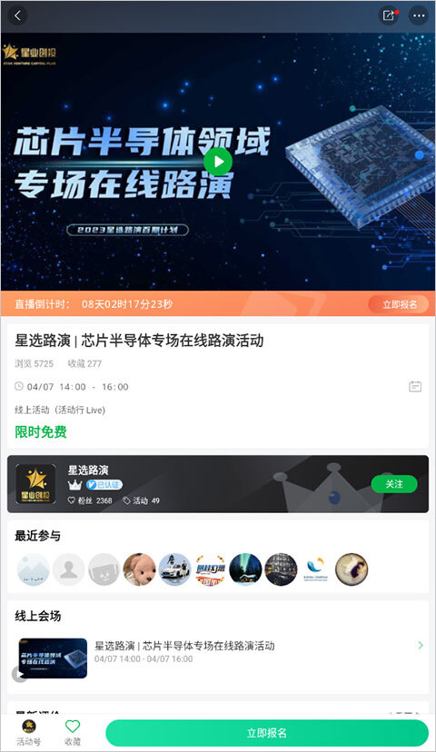 2、选择你想要看的直播活动并点击,进到页面后点击“立即报名”就能观看直播。