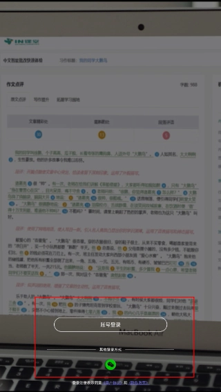 2、在作文评阅界面里,点击【账号登录】按钮,或者通过微信登录,都能跳转至账号相关操作环节,以便继续后续流程。
