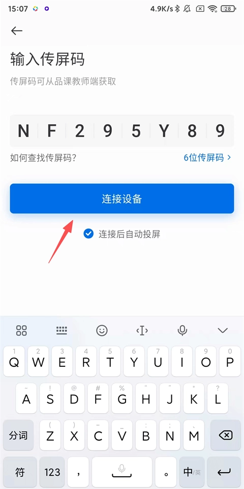 2、输入传屏码,点击【连接设备】(传屏码可从品课教师端获取)。