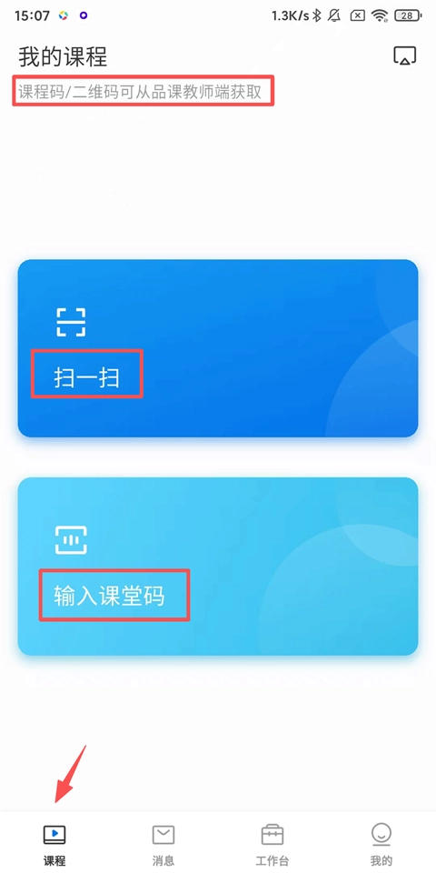 1、点进【课程】,点击上方【扫一扫】扫描课程码(课程码/二维码可从品课教师端获取);