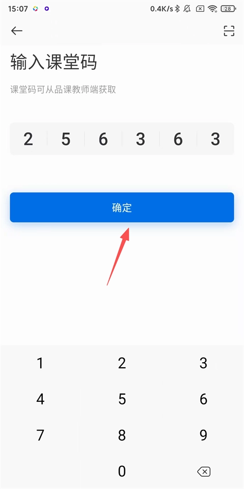 2、或者也可以点击【输入课堂码】,接着点击【确定】加入课堂(课堂码可从品课教师端获取)。